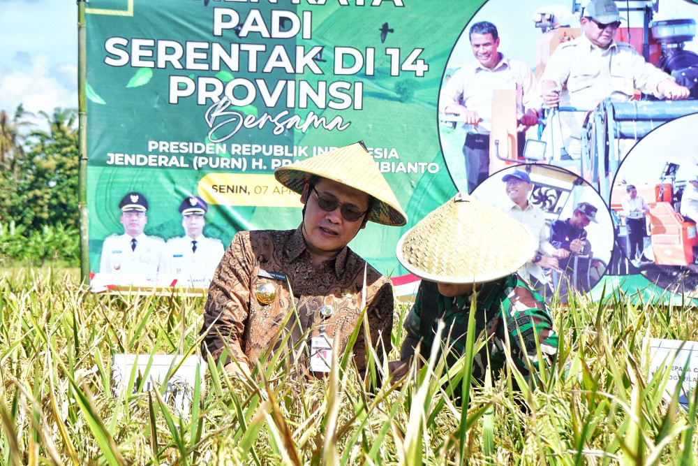 KOTA MUNGKID- Bupati Magelang Grengseng Pamuji bersama jajaran Forkopimda dan Organisasi Perangkat Daerah (OPD) terkait melaksanakan kegiatan panen raya padi secara serentak di 14 provinsi. Untuk di Kabupaten Magelang, panen raya padi ini dilakukan di Desa Deyangan, Mertoyudan, Senin (7/4/2025).