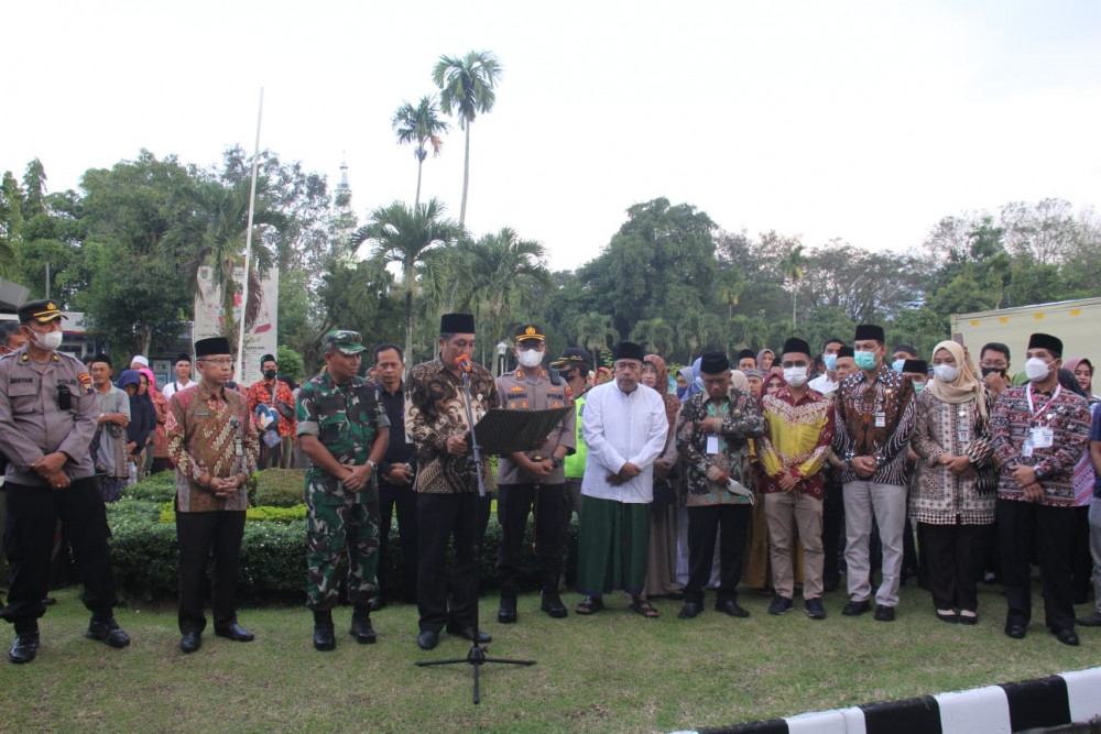 KOTA MUNGKID- Bupati Magelang Zaenal Arifin didampingi jajaran Forkompimda melepas keberangkatan ratusan jamaah haji kloter 12 asal Kabupaten Magelang. Pelepasan jamaah haji tersebut dilaksanakan di halaman Setda Kabupaten Magelang, Jumat (10/2/2022).