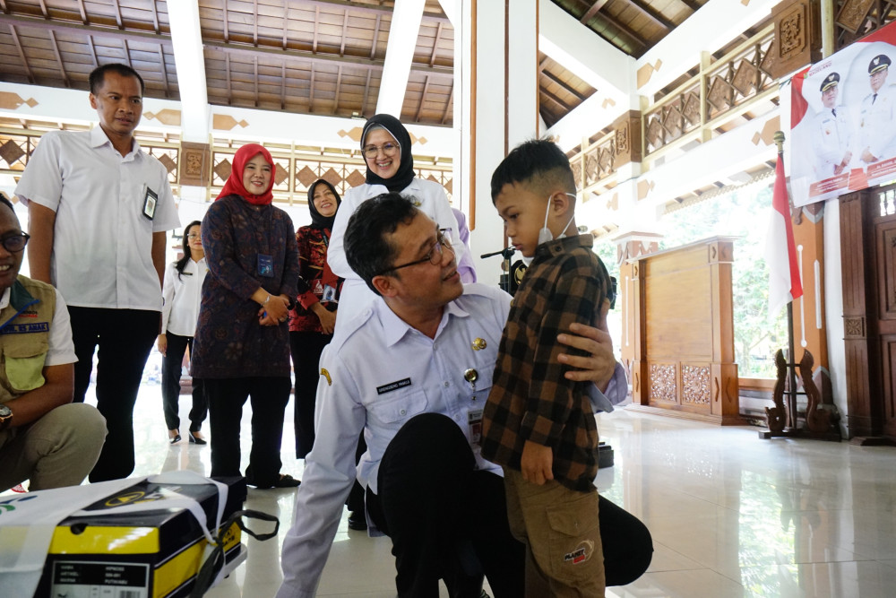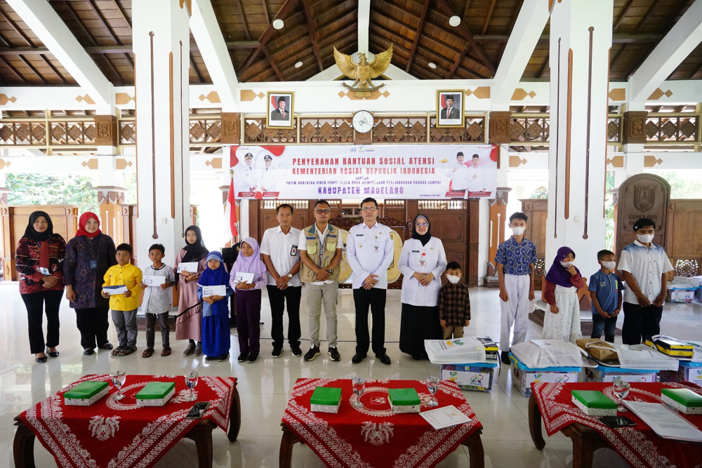 Kota Mungkid-- Bupati Magelang Grengseng Pamuji menyerahkan Bantuan Secara Simbolis Atensi dari Kementerian Sosial Kepada Yatim dan atau Yatim Piatu (YAPI) Serta Anak Memerlukan Perlindungan Khusus (AMPK), di Pendopo Merapi Rumah Dinas Bupati, Rabu (28/05/2025). (Foto-Ilham Dokpim Setda Kab Magelang).