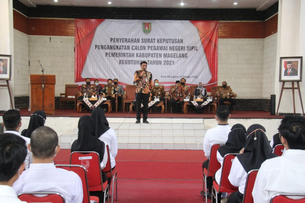 Menurutnya, pengangkatan CPNS baru ini sesuai dengan janji besar Pemerintah Kabupaten Magelang pada masyarakat untuk mewujudkan Kabupaten Magelang yang Sejahtera, Berdaya Saing dan Amanah (Sedaya Amanah).Â