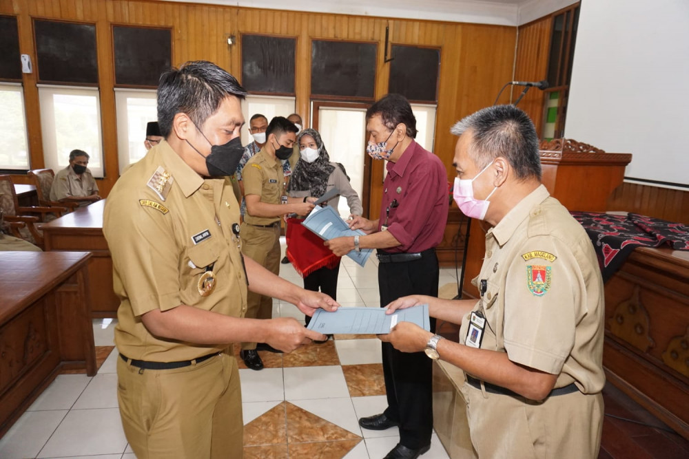 KOTA MUNGKID- Sebanyak 99 Pegawai Negeri Sipil (PNS) di lingkungan Pemerintah Kabupaten Magelang menerima Surat Keputusan (SK) pensiun TMT 1 April-1Mei 2022. SK pensiun tersebut diserahkan langsung oleh, Bupati Magelang Zaenal Arifin secara simbolis di Ruang Bina Karya, Kompleks Setda Kabupaten Magelang, Senin (14/3/2022).