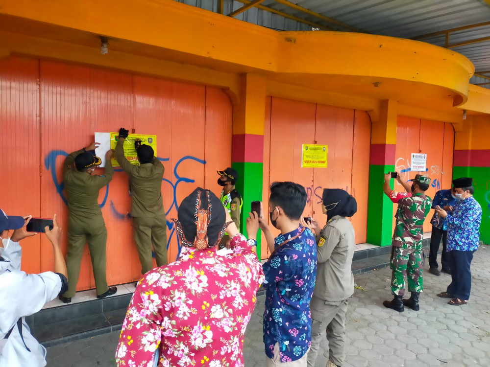 Petugas Satpol PP Saat melakukan penempelan stiker penutupan RM Bakso Balungan Pak Granat Secara Permanen.